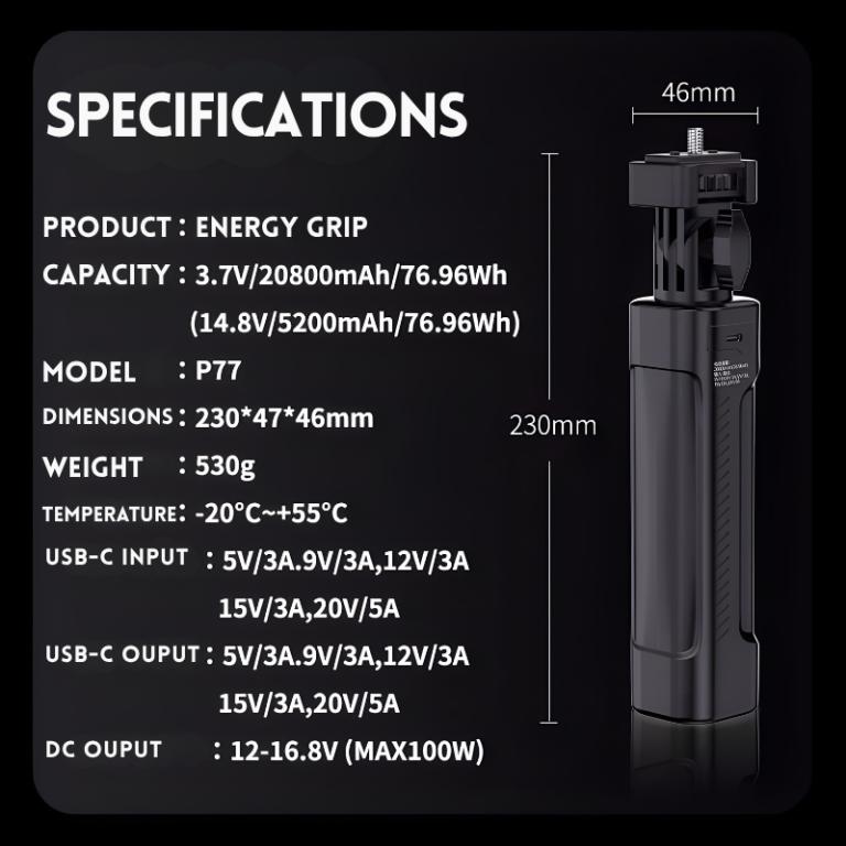 Home»Accessories»P77 P77LIYADI 100W Battery Grip what’s in the box Energy Grip: x1USB-C to USB-C cable: x1DC to DC Cable: x1Manual: x1Color Box: x1Storage bag: x1Silicone Pad: x1